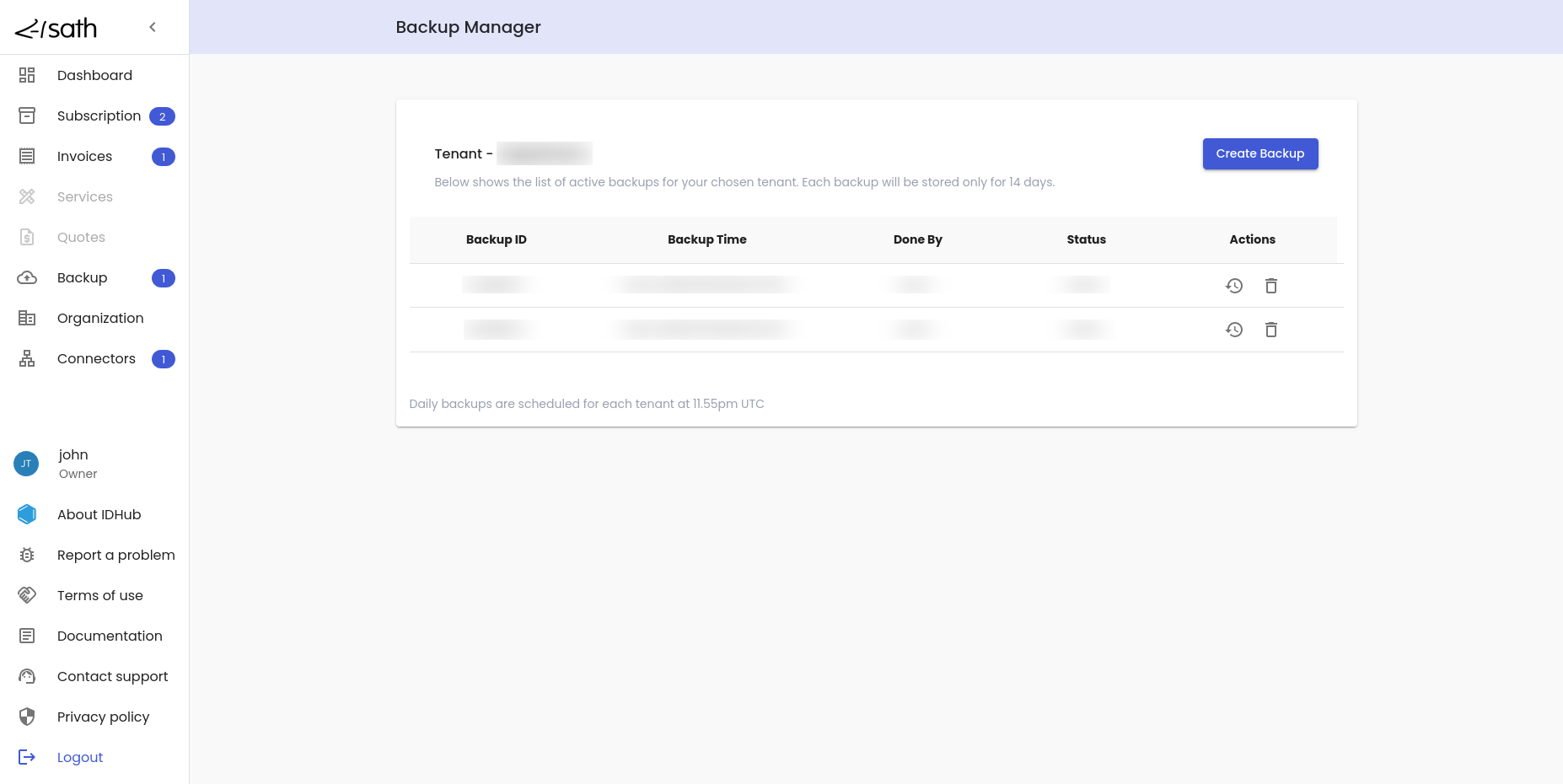 Create Backupbutton in order to create the backup for the tenant. A toast message will appear thatBackup Created Successfully. - IDHub creates the backup of the tenant and once the backup is completed, it will be added to the list of backups.